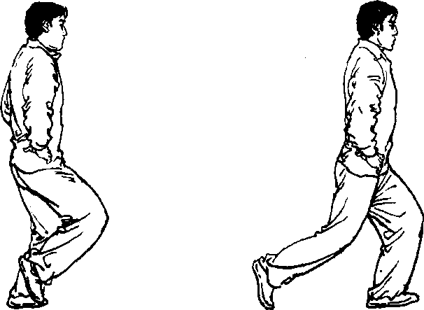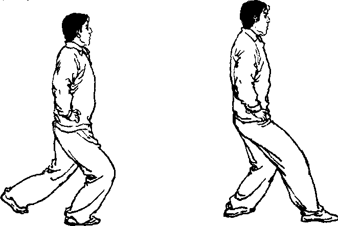 L屈膝蹲坐,身体重心移于右腿;左脚轻轻提起,后退一 步,脚尖点地(图23)。