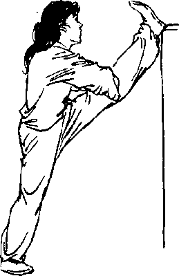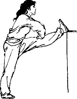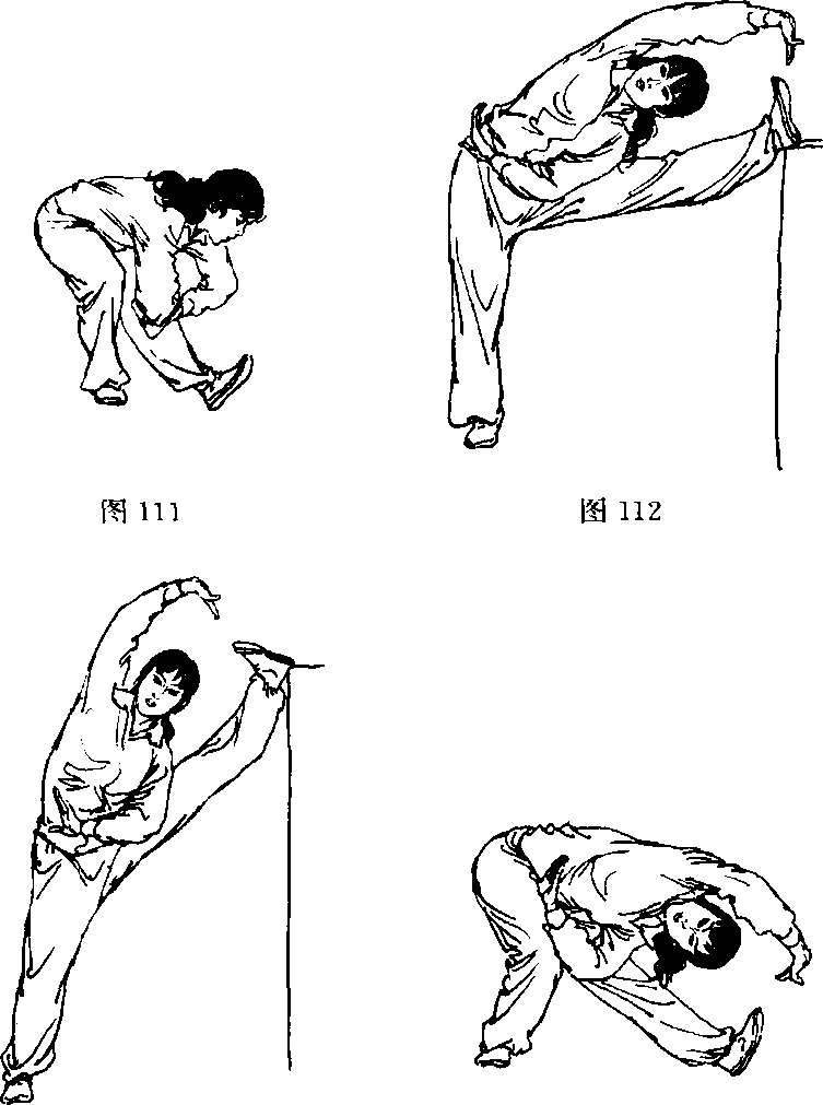 1 .正压:身体正面对支撑物,一腿支撑,另一腿前平举,脚 跟放在肋木或其它支撑物上,脚尖勾起,膝部挺直,两手按于 膝部或抱住脚尖,上身反复前俯振压(图109),力量和幅度逐 渐加大,使下须尽量触及脚尖.左右腿轮换练习。如果腿部高 举,脚放在较高支撑物上,称高压腿(图110兀脚放于地面时, 称低压腿(图111)。高压、低压的方法和要领皆与前相同。