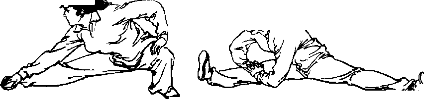 4 .坐压:身体坐于地面,两腿伸直,左右分开,两脚尖勾 起,两手按于膝部或搬住脚尖,上体反复前俯振压,使下须尽 量接近脚尖(图口6、口7)。两腿轮换练习。