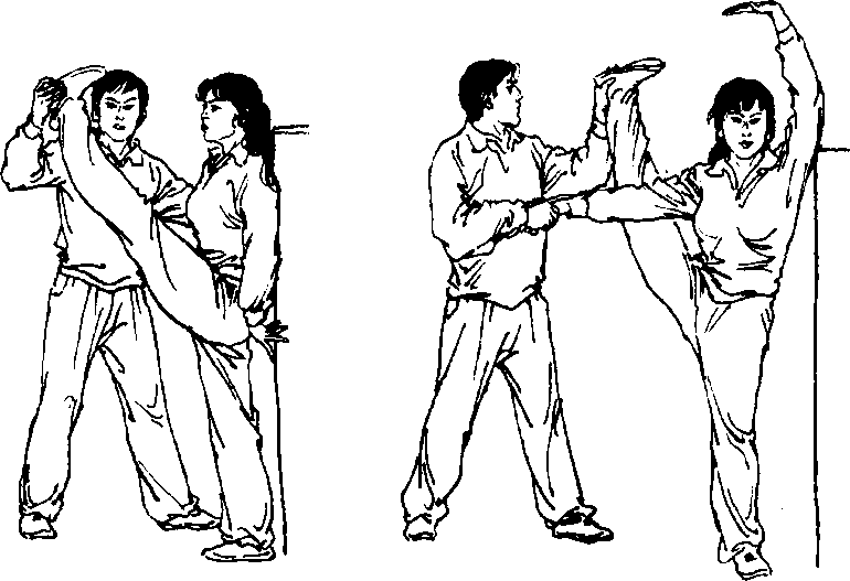 1 .正搬;背靠肋木或墙壁直立,一腿前上举,另一人手托 其脚跟,另一手扶其肩,向上托举振压,力量和振幅由小渐大, 使其脚尖尽量接近前额(图118),两腿交换练习。
