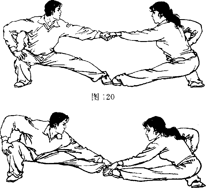 同侧手拉握,同时仆步向下振压,最后互相搬住对方脚内侧仆 步静止搬压(图120、121)。两腿轮换练习。