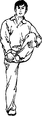 4 .抱搬:一腿支撑独立,另一腿屈膝 高提,两手分别抱住膝外侧和踝外侧,用 力向胸前搬压,使大腿贴近胸部,身体保 持正直稳定(图122)。两腿轮换练习。