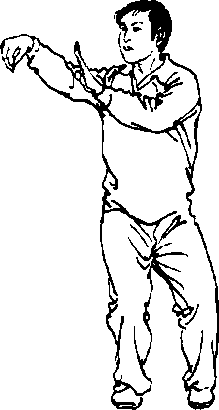 4 .挑掌时塌腕竖指,指尖向上,虎口张开,屈臂成弧。穿掌 时臂由屈而伸,四指向前,拇指及虎口向上。