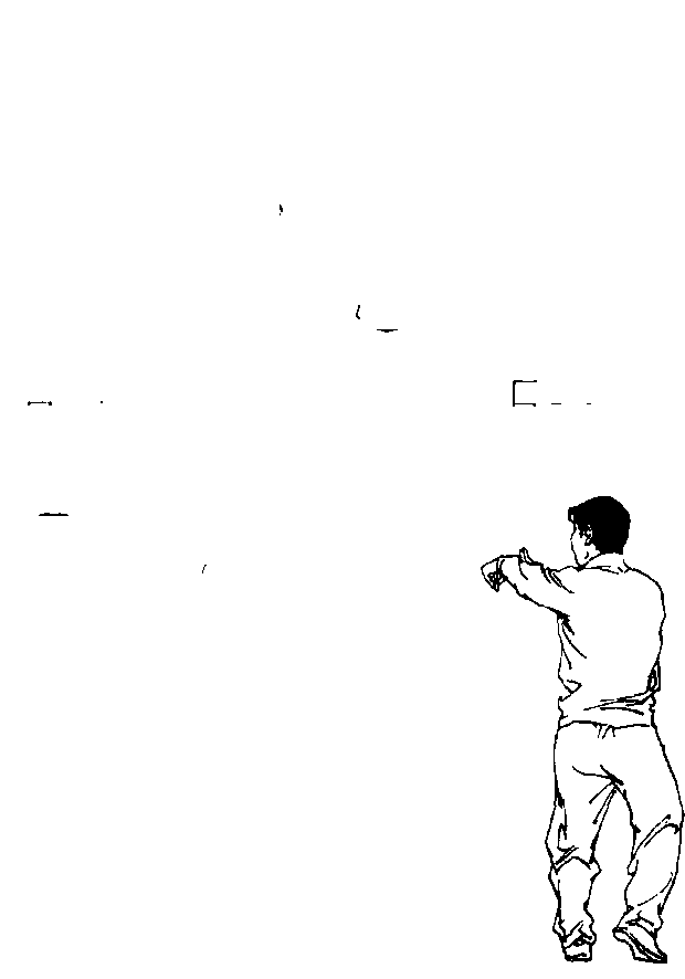 1 .两腿屈蹲,上体右转,重心右移,左脚跟提起。右手向右 前方伸展,屈腕刁勾;左手经头前摆至右臂内*侧,掌心向外。眼 看勾手(图291)。