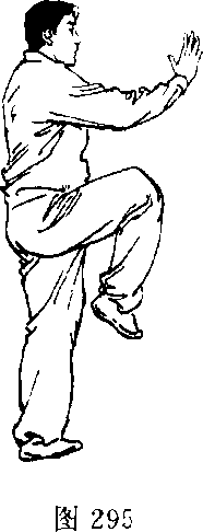 5 ,左腿蹬地,起身独立,上体稍左转,右腿屈膝前提,脚尖 向下,成左独立步。右勾手变侧掌挑至体前,高与头平;左掌内 旋按于体侧。眼看右掌(图295)。