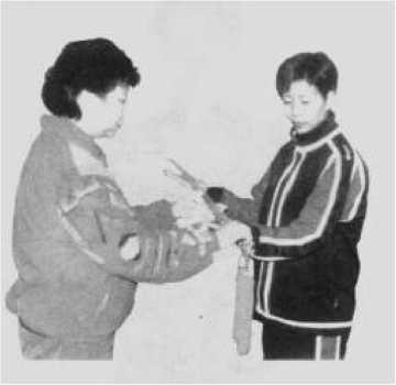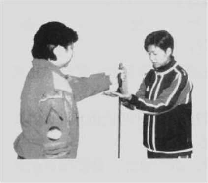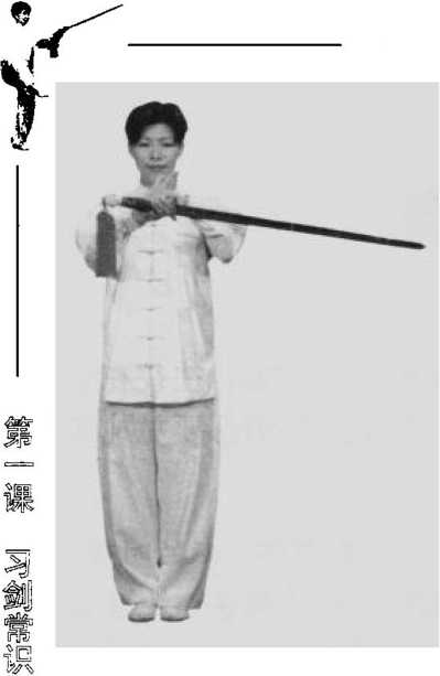 方法:老师单手提剑柄,将剑 举于胸前,学生恭然肃立,双手伸出, 手心向上,接捧剑格处,将剑接过来。 (注目?L