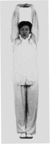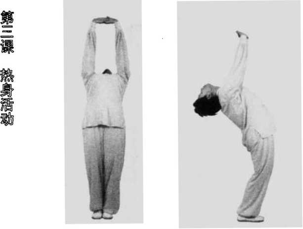 要求:双手上托呈舒胸仰体势,两手充分伸直垂直于地面,①两腹伸直,身体 仰体势(侧面) ②还原,呈双充分后仰 掌托天势