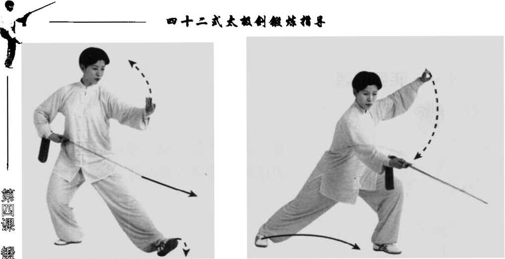 ④左脚前伸 ⑤弓步下刺提示;本势剑迹是由平带转身接下刺剑;后坐平带配合 吸气,膝屈肘转呼气,收腿转身吸气,下刺呼气。右脚内扣幅度尽量大,重心移到右脚后气要下沉,这样才 能稳住重心;右手肘尖与提膝的左脚呈斜直线,固定好位置 后,同时左转,这样转身幅度小,不会前俯后仰。