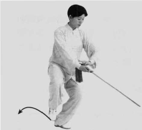 要点:重心前移,右脚收提 于左脚内侧;右手随势稍右移再沉 腕,使剑尖走一小半圆圈。