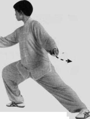 ②转体过渡要点:移重心(过渡 动作)右腿屈膝脚内扣,右 手屈肘收至腰间。