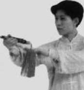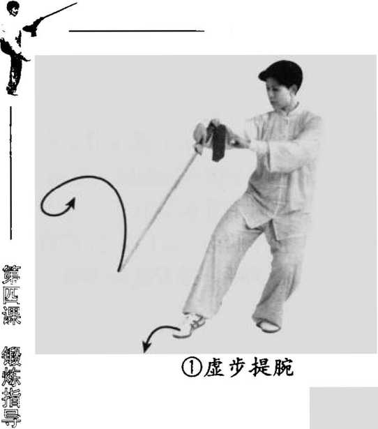 要点:右手提腕至 肩高,剑尖略低于腕;左 手下按附于右前臂。右手 提腕与右脚上步协调一 致,配合吸气。