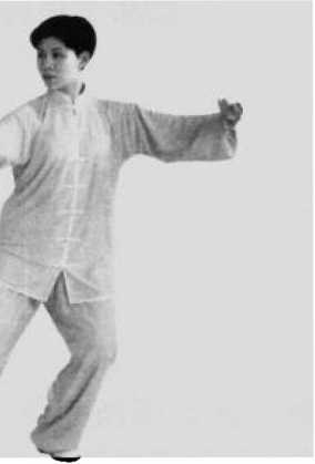 脚跟先着地;同时两手 前后展开,呈阴阳鱼状。