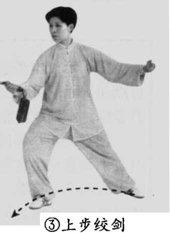 ④上步绞剑 要点:右手继续随 上步进行绞剑。⑤上步绞剑