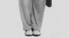 ⑤落手站立(过渡)要点:上步时吸气,身体 直立,两脚平行,屈膝过渡。