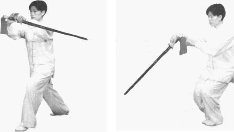 典型动作:第一段第二势“并步点剑”。方法:提腕,使剑尖由上向下点出。属性:进攻性剑法。要领:握把 力点 着力点 剑迹(正把正握,小指放松)(定点) (力达剑尖下锋)(弧形)①预备②点剑提示:与呼气配合。①预备②点剑二削剑典型动作:第一段第三势“弓步斜削”。0^0 II方法:自异侧下方经胸前向同侧前上方斜出,剑尖高于头。 属性:进攻性剑法。0^0 II要领:握把—体位—力点—着力点 剑迹(仰握) (平剑) (定点)(剑刃前半部) (弧形)提示:以腰带臂,转身削剑。①预备 ②削剑