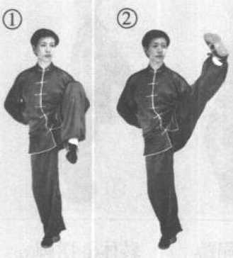 跨脚:支撑腿微屈站稳,另一腿屈膝 提起在体前,小腿上摆,脚尖 回勾,脚跟外蹬,高过腰部。