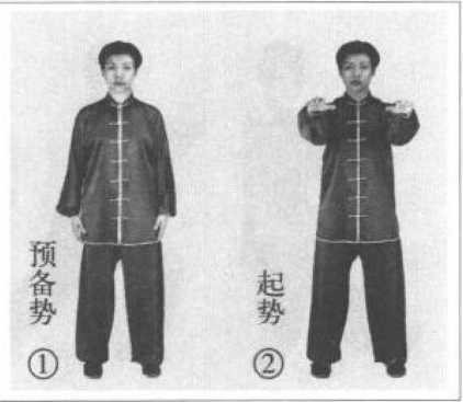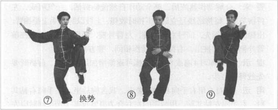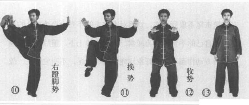 要领:独立蹬脚时,支撑腿微屈,膝部不可僵挺,上体保持直正, 头向上顶,支撑脚五趾抓地g呼吸与动作的配合是:两手臂前举时 为吸气,向下按落时为呼气;收脚抱掌时为吸气,独立蹬脚时为呼 气;收式两臂前平举时为吸气,向下按落时为呼气。