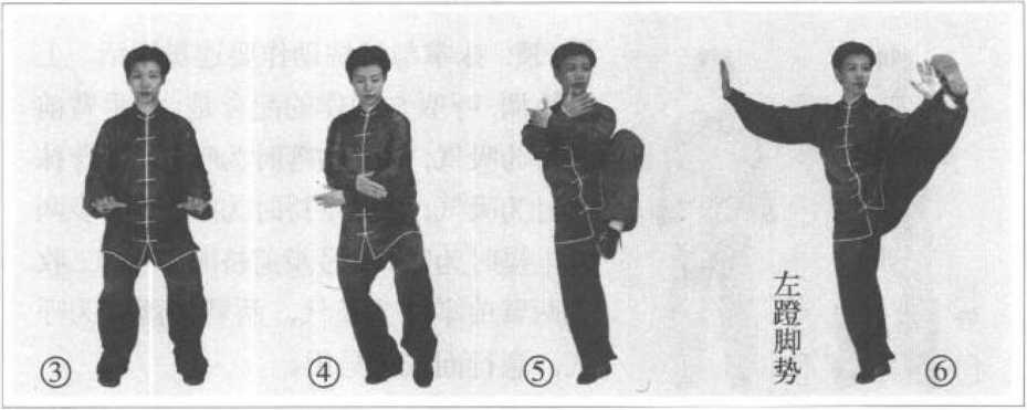 两脚开立 两臂前举与肩同宽 手心向下收脚(左)合掌提膝㈤抱掌 蹬脚(左)平分掌屈膝下按 落至腹前
