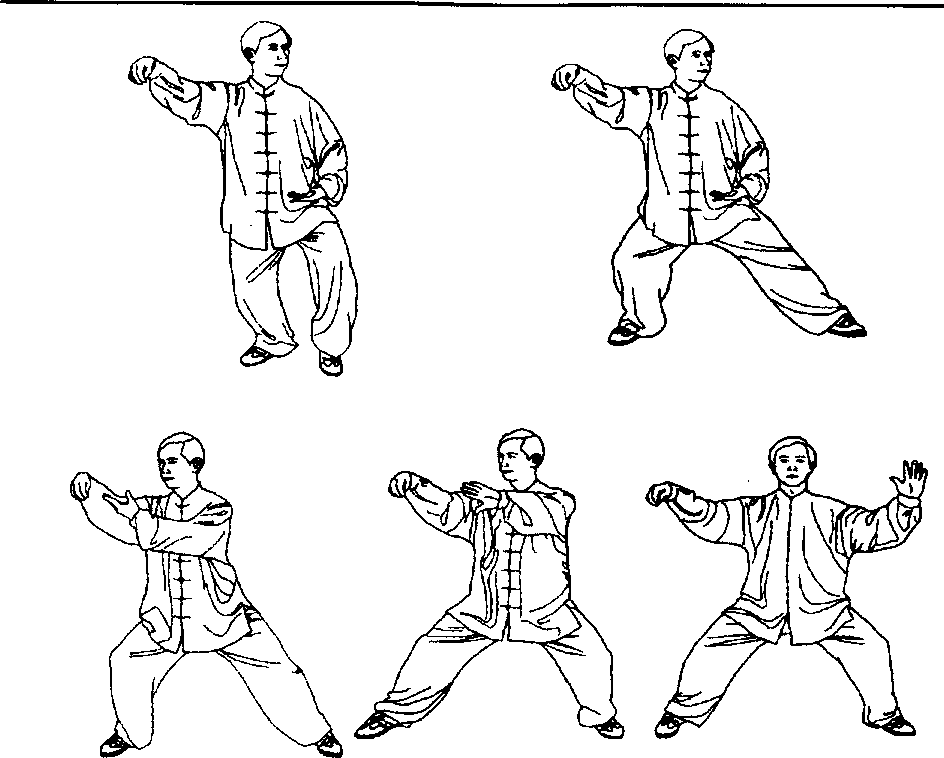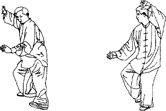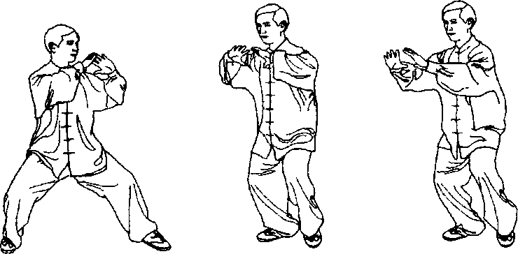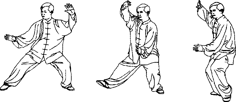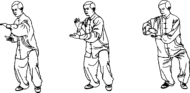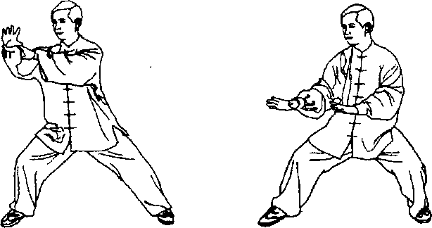 第四十式六封四闭与第三式“六封四闭”相同。第四十一式单U与第四式“单鞭”相同。第四十二式前招与第二十六“运手”动作(一)相仿,唯重心移至右腿,左腿 回收时,身体右转90° ,改变朝向。第叫十三式后招与第二十六式“运手”动作(二)相同,但方向有异,最后定 势时重心仍在左腿,不移向右腿。讲解: