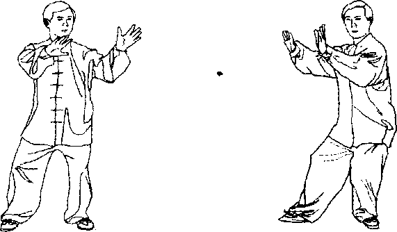 二、两手顺缠,身体右转下坐,重心移至左腿,右足跟翘起 外摆,目视左侧;|太极拳养生探微
