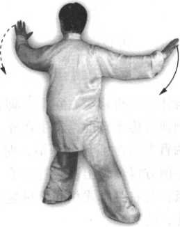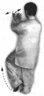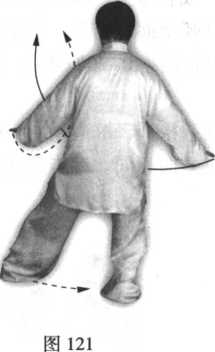 图122图122②身体重心再移至右腿,左脚收到右脚内侧,脚尖点地;同时两手由外圈 向里圈画弧合抱于胸前,左手在外,手心均向内;眼平看左方(图121、122)。