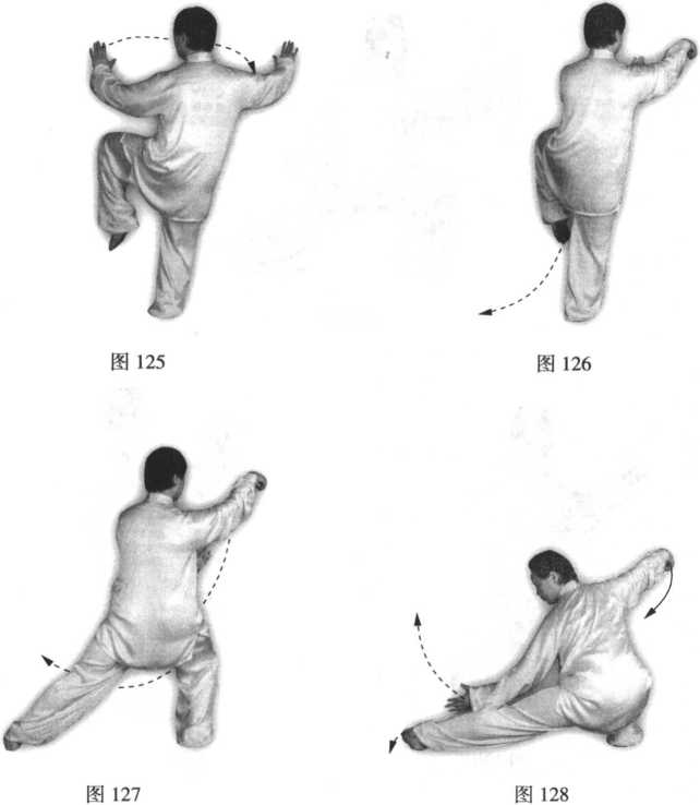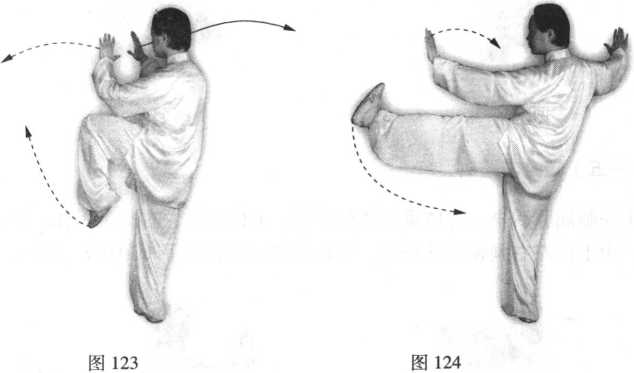 ③两臂左右画弧分开平举,肘部微屈,手心均向外;同时左腿屈膝提起, 左脚向左前方慢慢蹬出;眼看左手(图123、124)。