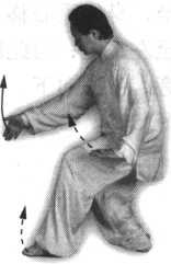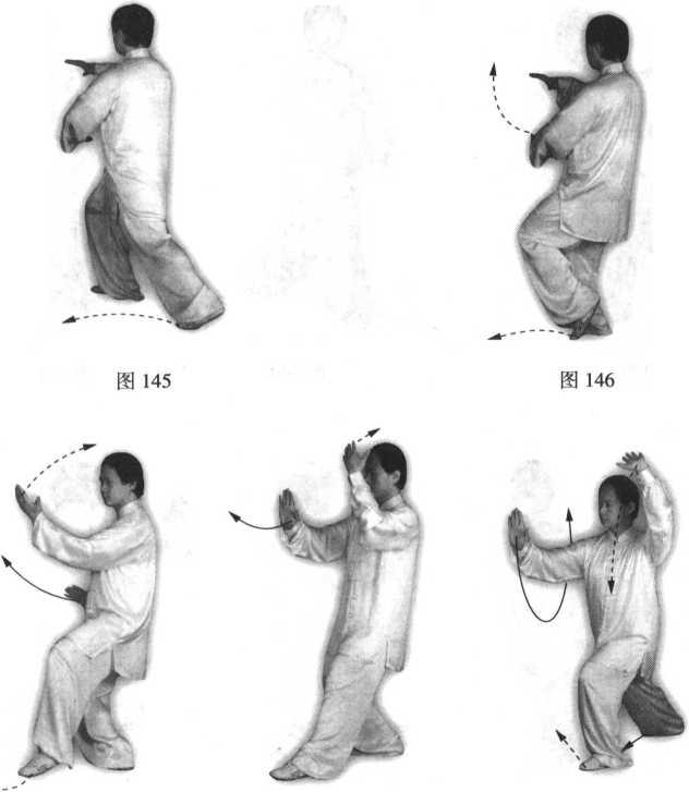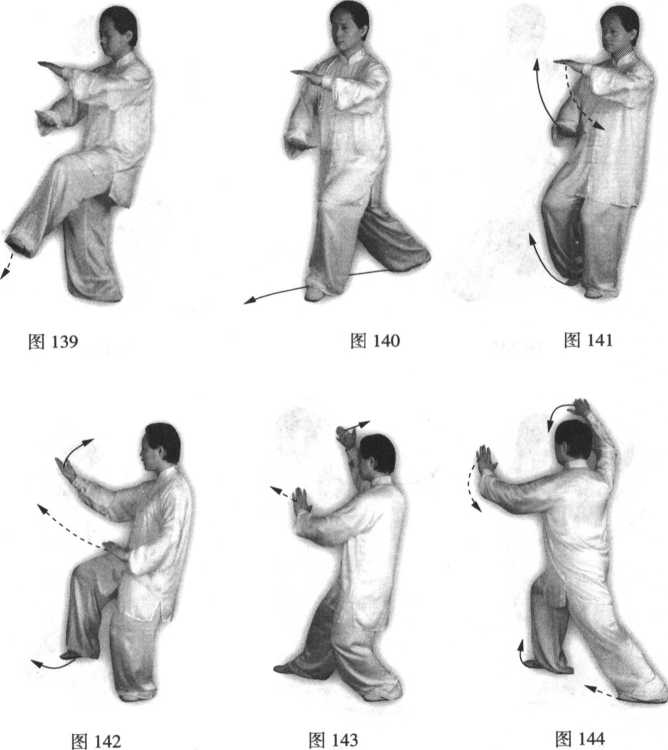 坐盘式;同时两手在左胸前成抱球状(左上右下);然后右脚收到左脚的内侧, 脚尖点地;眼看左前臂(图139~141 )。