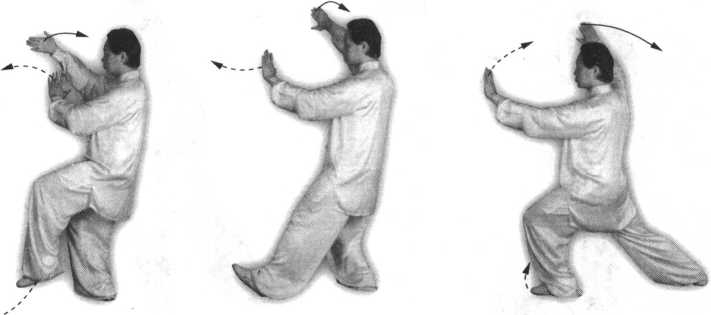 ③身体重心略向后移,右脚尖稍向外撇,随即身体重心再移至右腿,左脚 跟进,停于右脚内侧,脚尖点地;同时两手在右胸前成抱球状(右上左下);