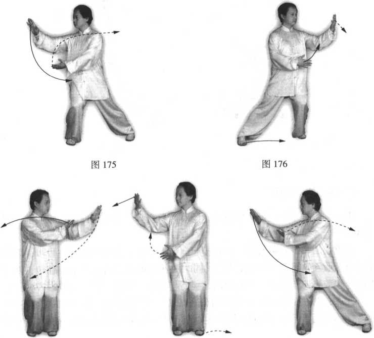 ②上体左转,重心移至左腿,右脚收于左脚内侧落地,两脚相距10~20厘 米,脚尖皆向前;同时左掌掌心向内,自右经面前向左立圆云转,至身体左侧 时翻掌向外,右掌自右经腹前向左立圆云转,掌心由外转向内;上体及视线均 随左掌转动(图176、177)。