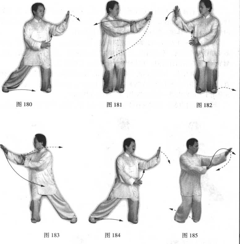 ⑤上述动作再重复一次,惟最后收并右腿时,右脚内扣约45。(图182~185 )。