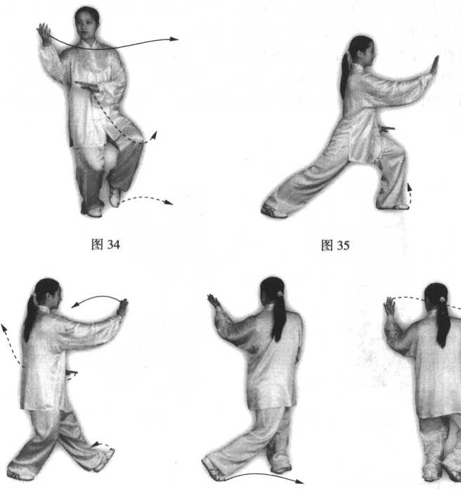 ③右腿慢慢屈膝,上体后坐,身体重心移于右腿,身体左转;左脚尖翘起 微向外撇,随后左脚掌慢慢踏实,左腿前弓,身体重心再移到左腿上,右脚收 至左脚内侧,脚尖点地;同时左手向外翻掌由左后向上画弧至左肩外侧,肘微 屈,手与耳同高,手心斜向上,右手随转体向上、向左下画弧落于左肩前,手 心斜向下;眼看左手(图36?38 )□