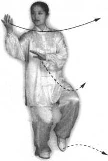 上、向前上方挑举,高与鼻尖平,掌心向右,臂微屈,右手收回放在左臂肘部 里侧,掌心向左;眼看左手食指(图32、33 )0
