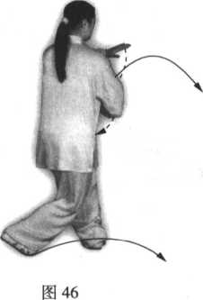 ①身体左转,左脚尖外撇踏实;同时,左掌翻转,左臂平屈胸前,手心向 下,右掌变拳由体前向左下画弧,至左肋旁,拳心向下;此时身体重心前移, 落于左腿,右腿微屈,脚跟提起向外扭转;眼看左手(图46)。