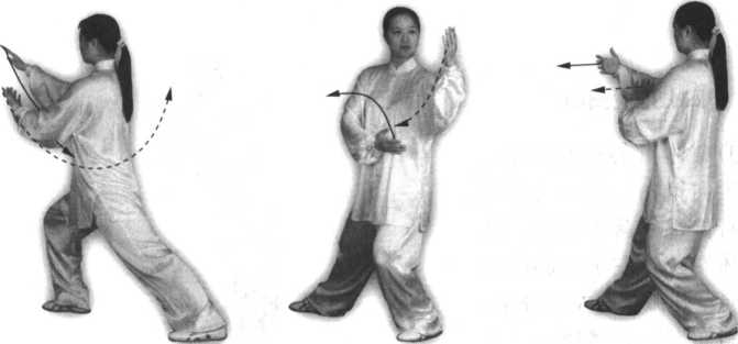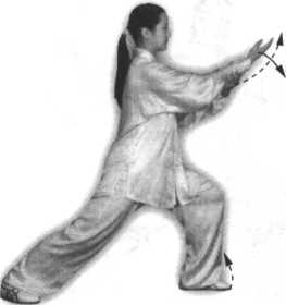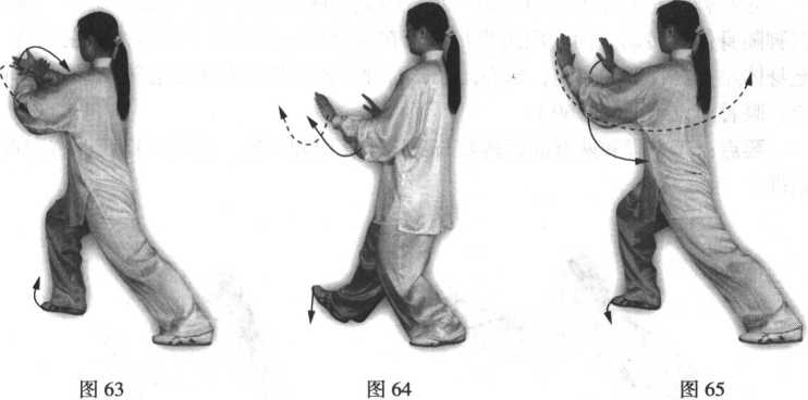 上体微向右转;随转体右手从右下侧上举,约与肩同高,手心斜向下,同 时左手翻转,手心向上,落至右前臂下方,然后做捋、挤、按动作,方法均与 “揽雀尾”式相同,只是方向同“抱虎归山”式(图60~65)。