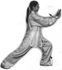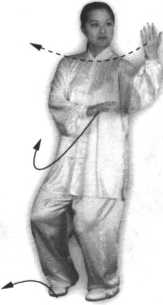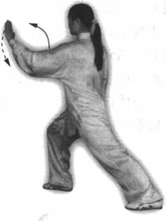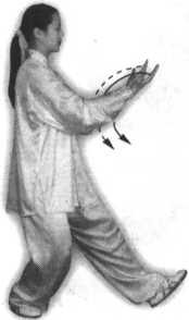 ①身体重心微向右移, 左脚尖向里扣,然后两腿屈 膝,身体重心落于左腿,随 即身体左转;左手由胸前向 下、向左画弧至与左肩齐平, 手心斜向上,右臂屈肘,右 手回收至左肩前,手心斜向 下;眼看左手(图58)。
