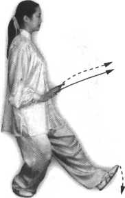 向右后侧迈一步,屈膝成右弓步; 同时右手随转体动作向下、向右 搂按放在右膝外侧,左臂屈肘, 左手经左耳旁向前推出,高与鼻 尖齐平;眼看左手(图59)。