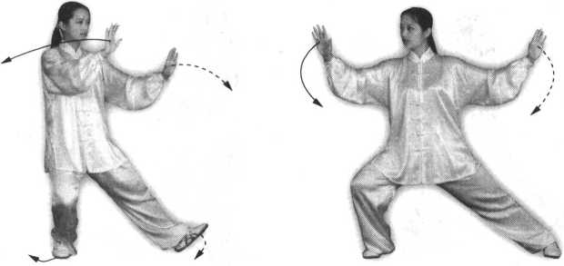 ①身体重心移向右腿,左脚尖里扣,向右转体;右手随转体动作向右平摆 画弧,与左手成两臂侧平举,掌心向前,肘部微屈;同时右脚尖随着转体稍向 外撇,成右侧弓步;眼看右手(图54、55 )o