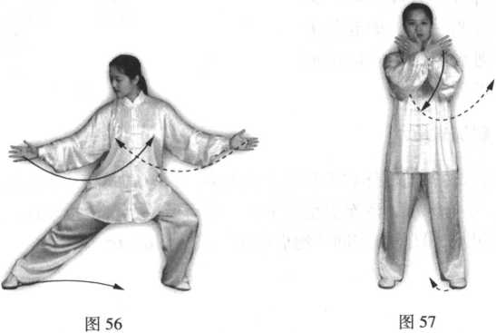 ②身体重心慢慢移于左腿上,右脚尖里扣,随即右脚向左收回,两脚距离 与肩同宽,两腿逐渐蹬直,成开立步,脚尖向前;同时两手向下经腹前画弧交 叉合抱于胸前,两臂撑圆,腕高与肩平,右手在外,成十字手,手心均向里; 眼看前方(图56、57 )o