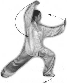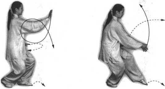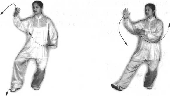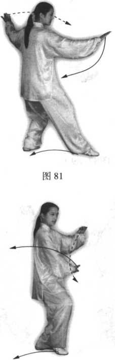 ①上体微向左转;同时左手向后上方画弧平举,手心斜向上,右手松腕, 掌心斜向下;眼随转体先向左看,再转向前方看右手(图81 )。