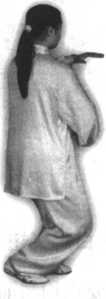 ②左手画弧,左臂平举胸前,左手手心向下,右手经体前下方画弧与左手上下 相对;右脚收至左脚跟旁,脚尖着地(图82 )。