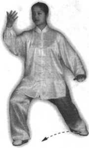 同时,左手向前、向下画弧落于左胯旁,手心向下,指尖向前;眼看前下方 (图 94、95 )o