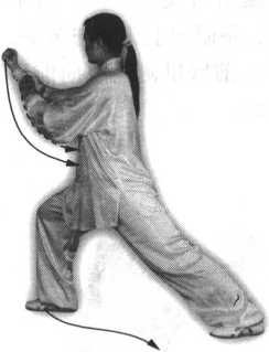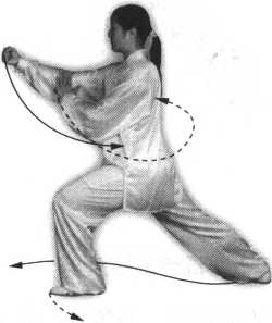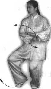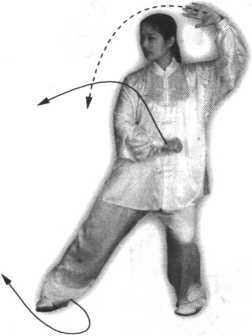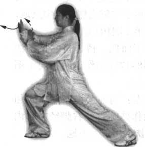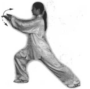 腿,左脚尖里扣,身体向右转,然后身体重心再移至左腿;与此同时,右手随 转体向右、向下(变拳)经腹前绕行至左肋旁,拳心向下,左手上举于头前上 方,臂成半圆形,手心斜向上;眼看前方(图97)。