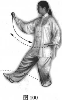 前翻转撇出,拳心向上,左手由 右臂外侧落于左胯旁,掌心向下, 指尖向前;眼看右拳(图100)。