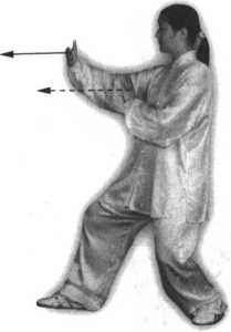 要点:右脚应先收回(不点地)再迈出。弓腿和撇拳动作要一致。“撇身 捶”弓步方向应为正西稍偏北(约15。)。