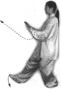 手心向上,与左手成抱球状;右 脚前进停于左脚内侧,脚尖点地; 眼看左手(图103)。