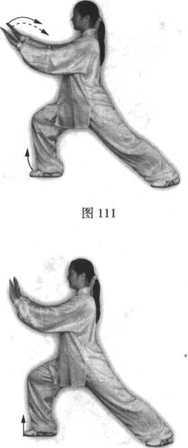 图106图106图107图107要点:与前“揽雀尾”式相 同。动作熟练后,右脚经左脚内 侧时,脚尖可以不点地。