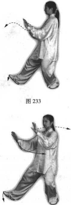 ②左脚向左前方迈出,成左弓步;同时左臂向左前方搠出,左手高与肩 平,右手向右、向下落于右胯旁,手心向下;眼看左前臂(图223)。