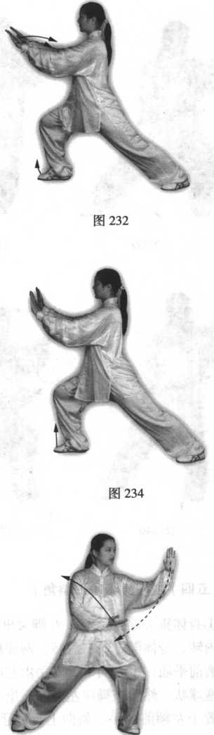 195195①上体后坐,身体重心移于左腿,右脚尖翘起微向外撇,随即右腿前弓, 身体右转,重心移于右腿;同时,右手翻掌向下收在胸前,右臂平屈,左手经 腹前向右上画弧放在右手下,两手心相对成抱球状;左脚跟步至右脚内侧,脚 尖着地;眼看右手(图220~222 )。