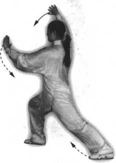②身体重心移于右腿,左脚尖里扣,身体向右后转,身体重心再移至左 腿,右脚收至左脚里侧,前脚掌着地;同时左手下落平屈于胸前,右手下落在 腹前,手心向上,与左手相对成抱球状;然后以左脚掌为轴,身体再向右后 转,右脚向右前方迈出一步,弓腿成右弓步;右手上举置于右额前,手心斜向 上,左手则向前推出;眼看左手(图243~245 )。