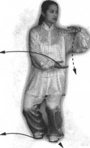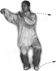 举时,不要引肩上耸;前推动作要与松腰弓腿动作上下协调一致(左右要领 相同)。弓步两脚横向距离保持约30厘米。左右穿梭动作要面向四个斜角, 如面向南起势,穿梭方向分别为西南、东南、东北、西北。
